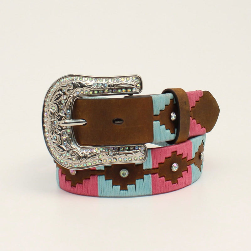 Your little one will look so cute and grownup in this Angel Ranch belt by M&F Western Products. Genuine leather, with pink and blue lacing in southwestern pattern and clear stones down the length of the belt.