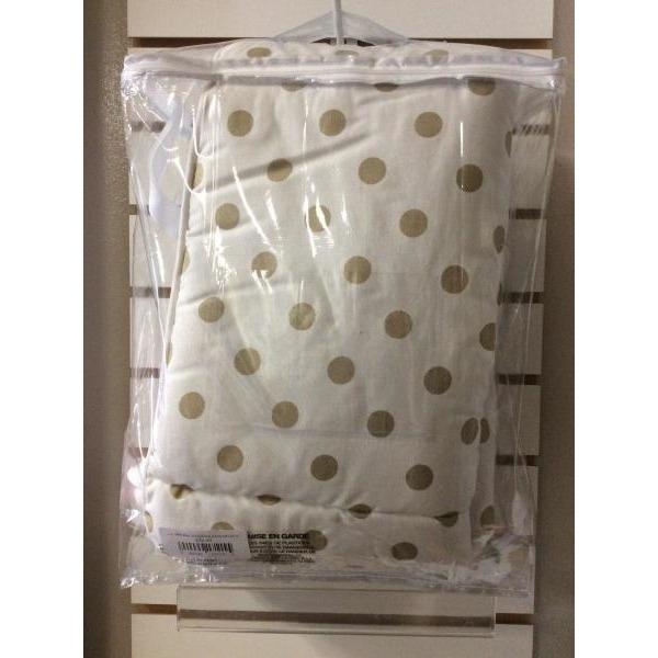 This gorgeous crib rail cover features shimmery gold polka dots on white background! Finished with white cording and white grosgrain ribbon, the crib rail cover is 51″ x 18″ when laying flat. It is filled with recycled polyester fill.