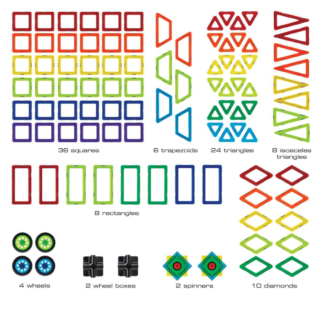 The GeoSmart Educational Set is a STEM learning kit featuring 100 pieces and 6 different geomagnetic shapes. Build original constructions, animals, vehicles or just about anything you can imagine!