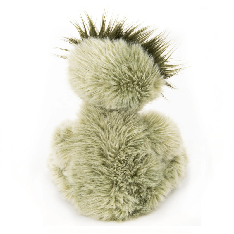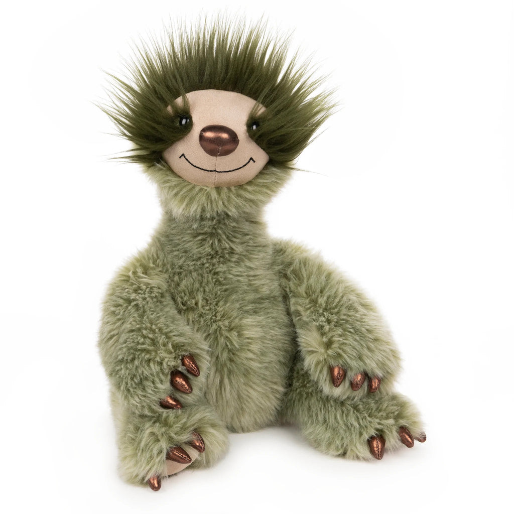 Roswell is a funky 11.5” three-toed sloth with fluffy, soft green plush fur and a metallic nose with shiny matching bronze clawed toes. This slow, contently lazy cuddle buddy always has fun on the mind, donning a wide, contagiously friendly smile on his beige faux suede face. Roswell’s uniquely textured and printed plush and wild, fuzzy head set him apart from other sloths and makes him both a cuddly playtime companion and an eye-catching piece of room décor for any age of animal lover. Surface washable. Appropriate for ages 1 and up.