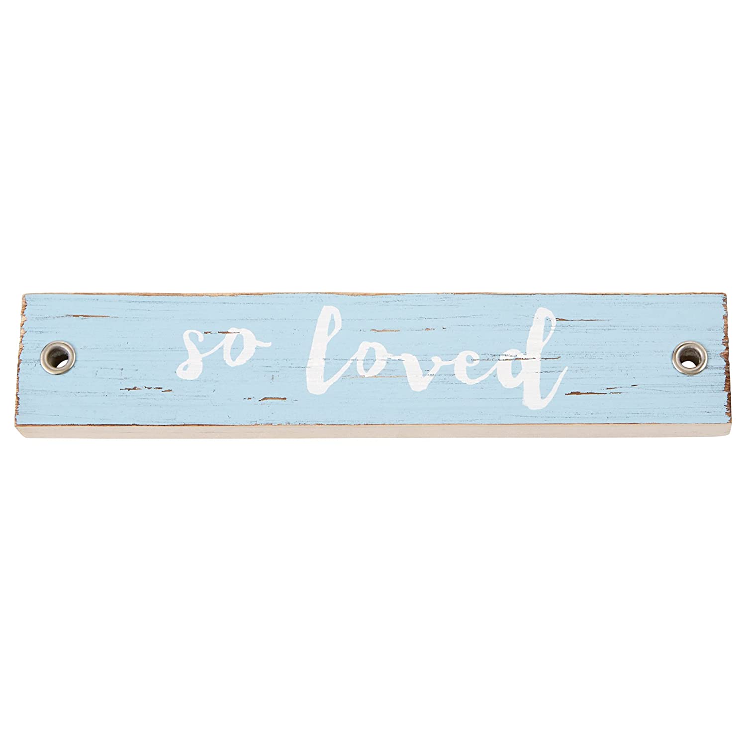 - Small painted wood sentiment stick features silver grommet detail and hang with saw tooth hardware.