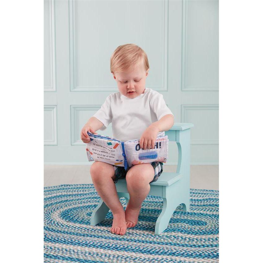 Soft printed cotton baby safe book with sensory crinkle paper features illustrated pages about life's bumps and bruises and removable gel ice pack bandage to soothe baby's latest "ouch!"