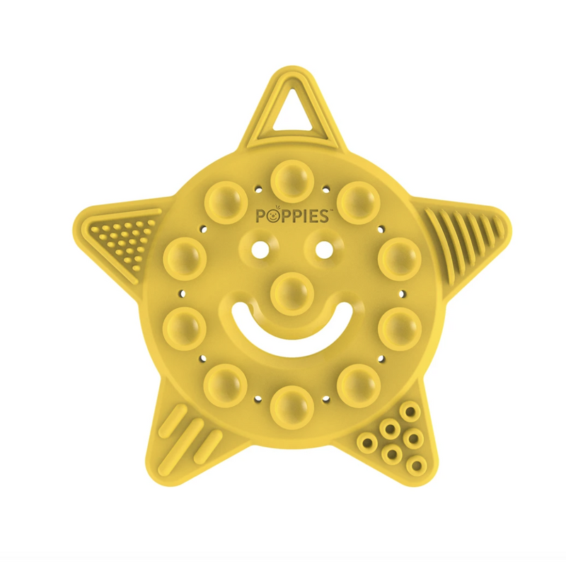 SMILEY the Star is a versatile teething toy that combines a playful star shape, five sensory textures & suction cups on multiple sides to stimulate development and soothe aching gums in babies. SMILEY will bring a happy, smiley face to any child that experiences the fun of play in POPPIES™. The teether toy is small enough for on-the-go travel & flexible enough for little hands to grip and hold.