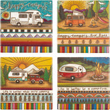 A set of four absorbent stoneware coasters with cork bases featuring colorful wood burned camping-themed designs. Coasters also feature "Happy Camper," "Happy Campers Live Here," "Life Is Better By A Campfire," and "Life Is Better When You're Camping" sentiments. Wire holder included.