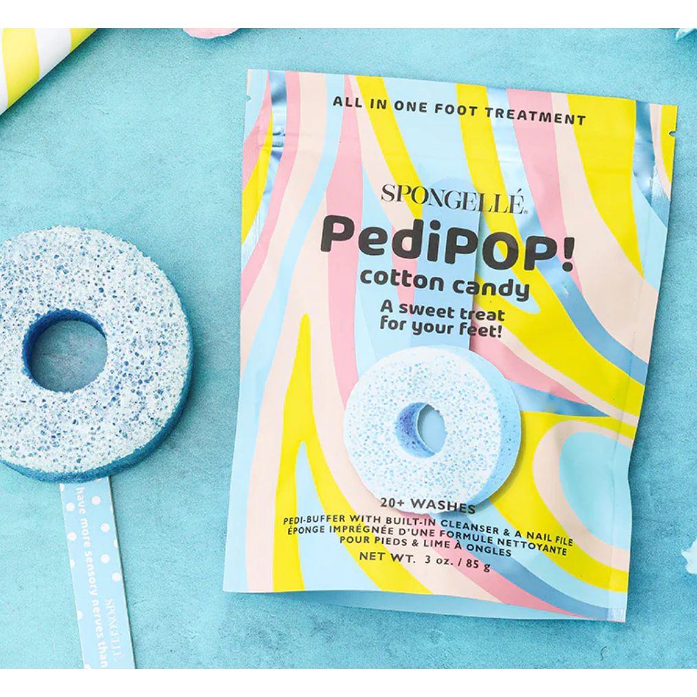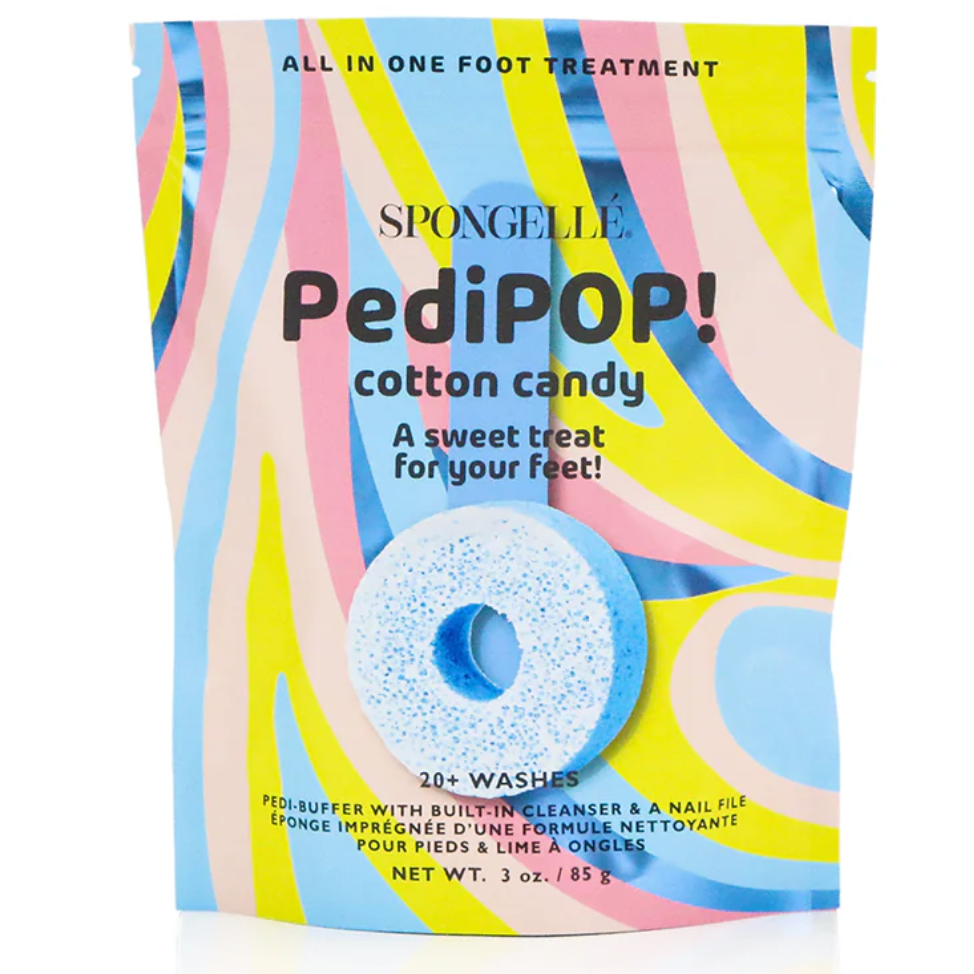 Pamper your feet with PediPOP! Spongelle’s® innovative All-in-One Pedi Treatment includes a pedi buffer with built-in cleanser and nail filling system in nostalgic Cotton Candy with soothing pomegranate, inflammation-reducing cherry blossom, and softening sugar musk for a skin-nourishing treat for your feet. Infused with our indulgent Triple Butter Formula and Sugar Cane Extract, this popsicle-inspired, luxuriously sweet at-home pedicure offers spa quality nail grooming, heel softening, and a soothing cleanse for deliciously soft feet.